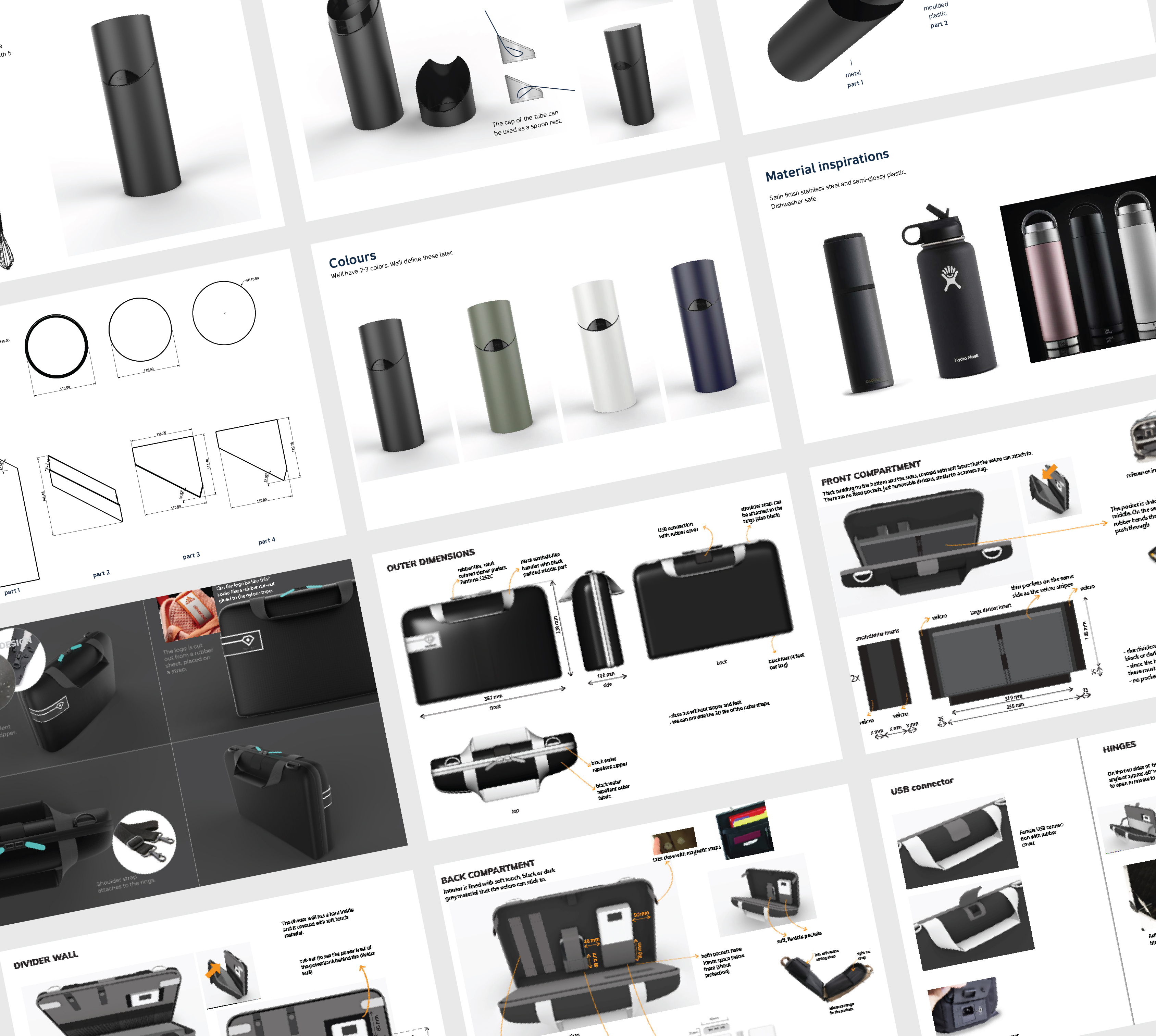 Creating the main vision that will guide the whole product development journey. Multiple visual solutions for the idea, presented as sketches, and/or 3D models. The concepts range from from "mild" to "wild", all of which are balance user experience, manufacturability and visual appeal.